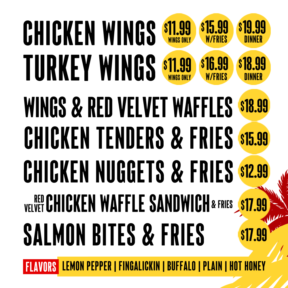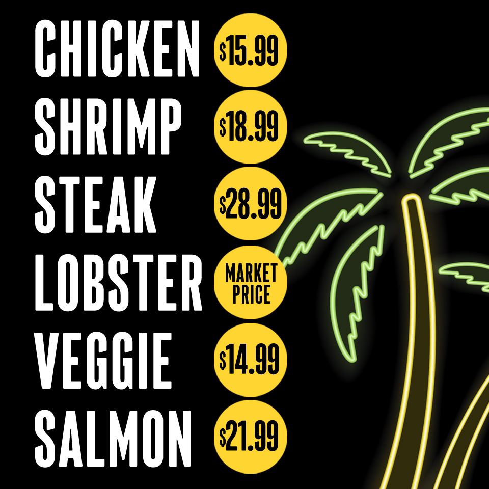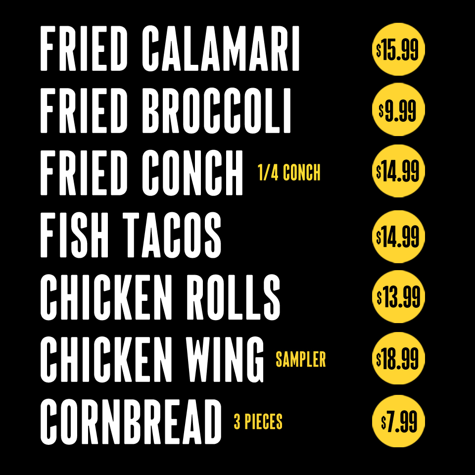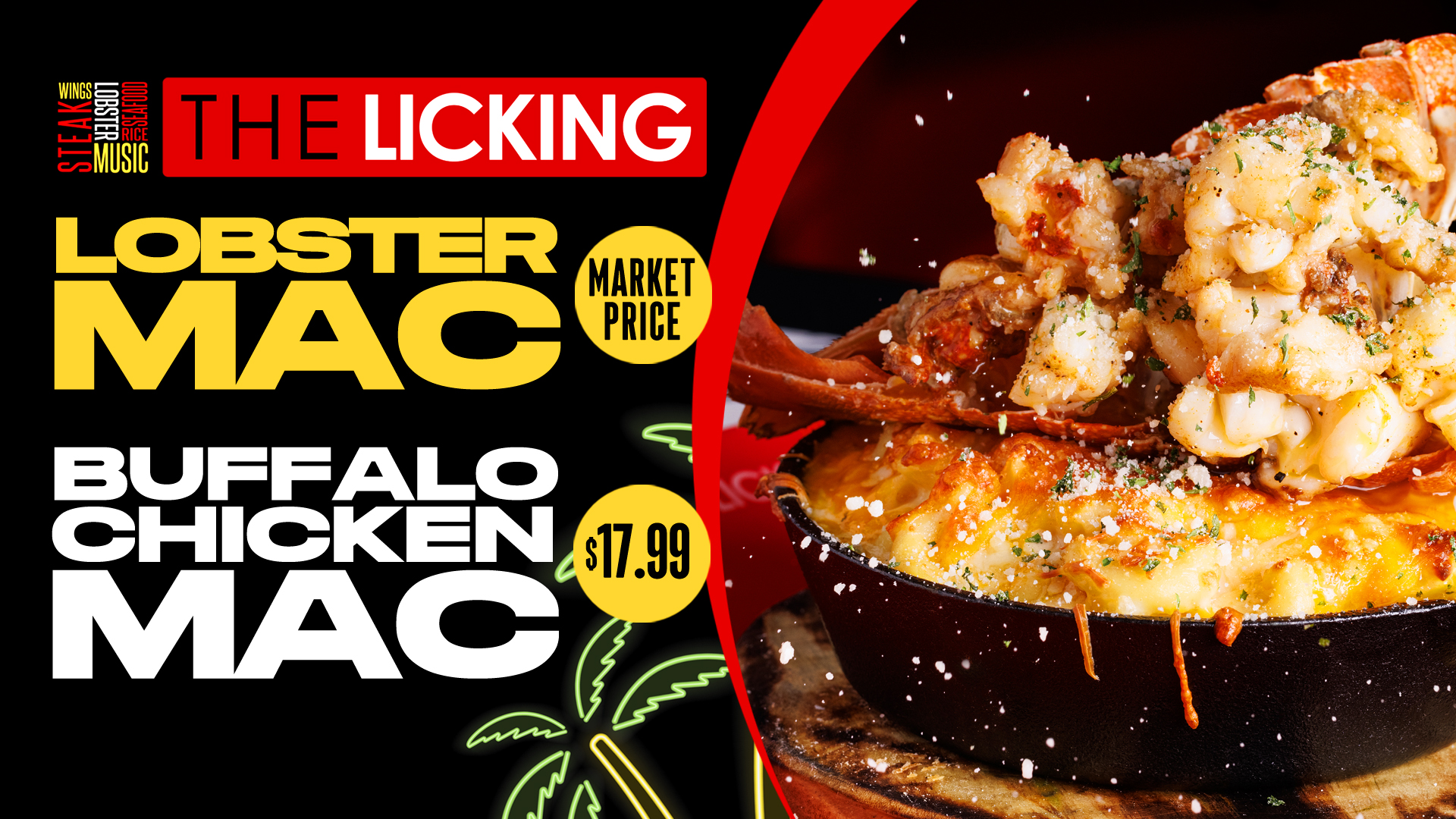 WINGS · SEAFOOD · MUSIC · PASTA · DRINKS · TURKEY WINGS · FRIED LOBSTER · MAC & CHEESE · MYSTERY DRINKS · FISH TACOS · CALAMARI · SALMON · CHICKEN TENDERS · LOBSTER MAC ·